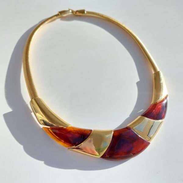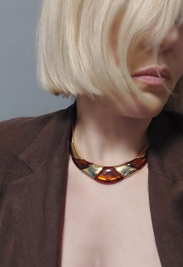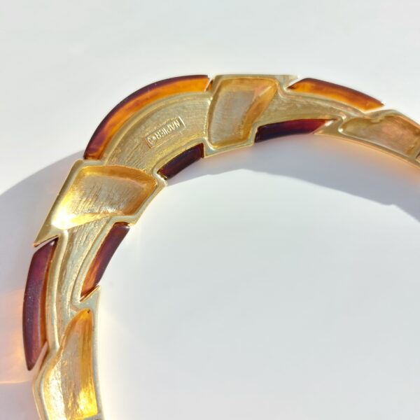 Колье винтажное в сплаве золотого тона. Представляет собой крупный чокер с коричневыми, пластиковыми вставками. Красивый чокер, хорошо ложится на шее, имеет приятную тяжесть. В хорошем винтажном состоянии. Маркирован Napier.