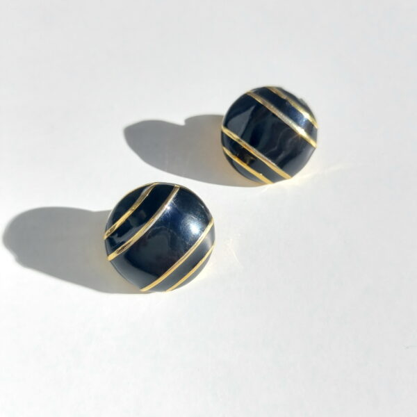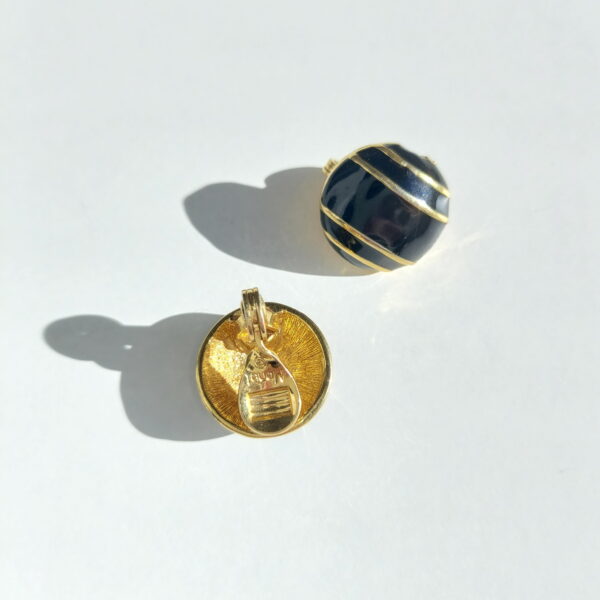 Клипсы винтажные в сплаве золотого тона. Имеют круглую форму, выпуклые, покрыты черной эмалью. На поверхности клипс расположены по две параллельные золотистые полоски. Клипсы в хорошем винтажном состоянии. Маркированы Monet.