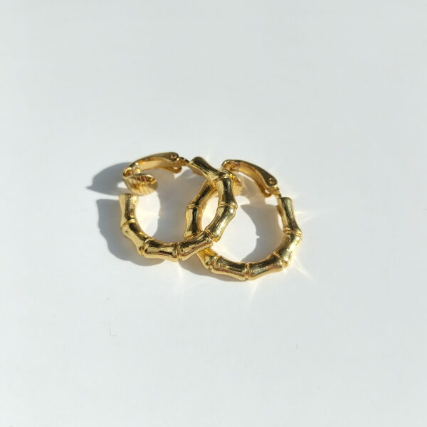 Клипсы винтажные в сплаве золотого тона. Выполнены в форме колец с бамбуковыми сегментами, поверхность гладкая. Размер — 2,0 x 2,3 см. В хорошем винтажном состоянии. Маркированы Avon на зажимах.