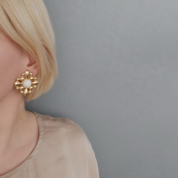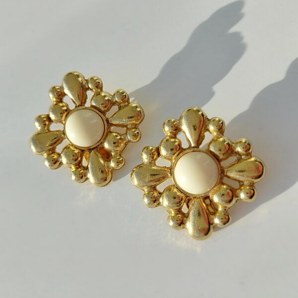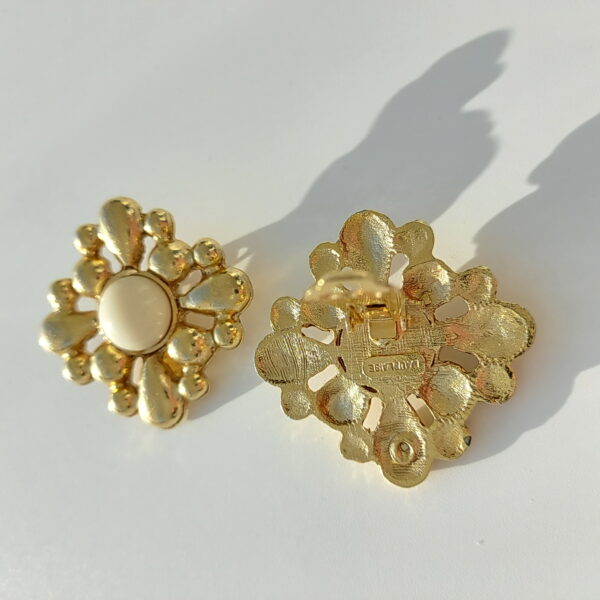 Клипсы винтажные в сплаве золотого тона. Крупные, подиумные клипсы в форме ромбов с бежевыми, пластиковыми, круглыми вставками. Размер — 4,1 x 4,1 см. Очень красиво смотрятся на ушке. В хорошем винтажном состоянии. Маркированы Dauplaise.