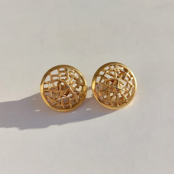 Клипсы винтажные в сплаве золотого тона. Клипсы круглой формы на поверхности гладкие и брашированные звездочки. Размер — 2,3 x 2,3 см. В хорошем винтажном состоянии. Маркированы Trifari.