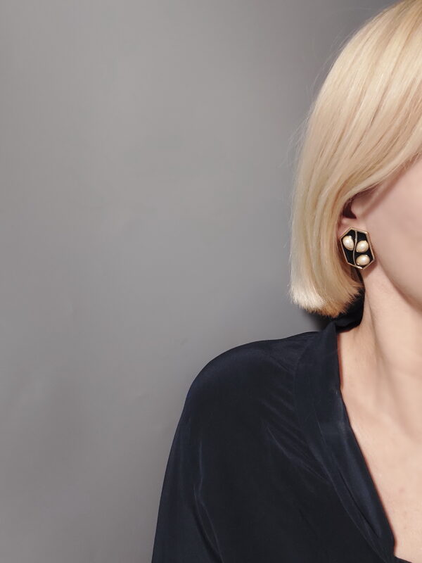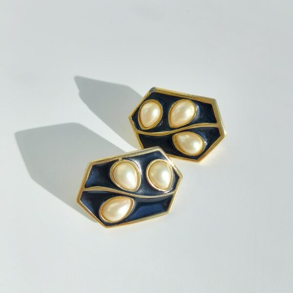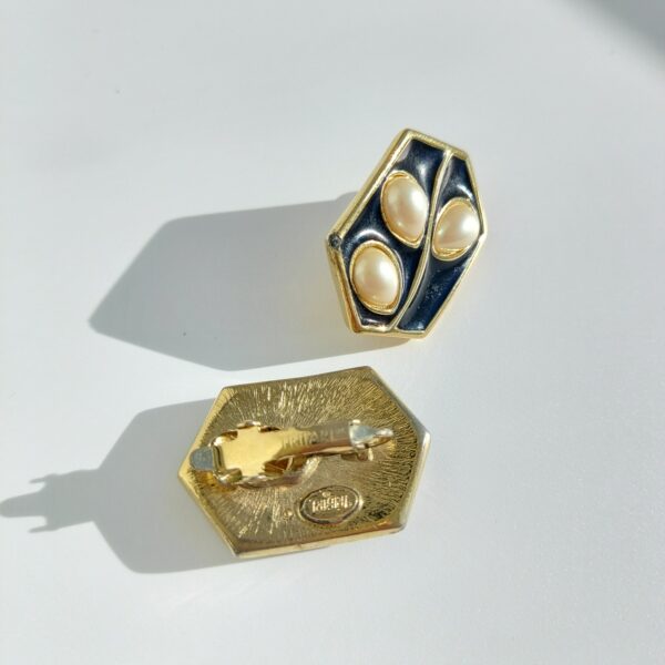 Клипсы винтажные в сплаве золотого тона. Форма прямоугольная, поверхность покрыта темно-синей эмалью с каплевидными кабошонами, рисунок напоминает растительный узор. Размер — 3,0 x 2,0 см. В хорошем винтажном состоянии, сходы на двух углах. Маркированы Trifari.