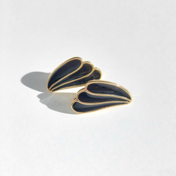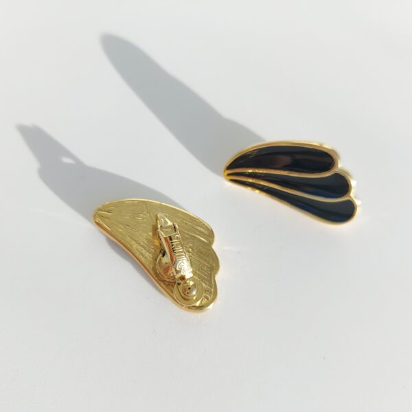 Клипсы винтажные в сплаве золотого тона. Выполнены в форме изогнутых плавных крыльев, поверхность покрыта черной эмалью. Классические, лаконичные. Размер — 1,4 x 2,1 см. В хорошем винтажном состоянии. Маркированы Trifari.